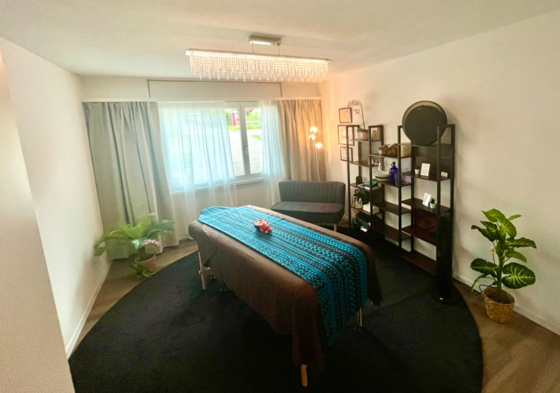 Zum Raum gehört eine fixe Massageliege, ein Bad mit WC, Dusche und Badewanne sowie eine Tee/Kaffeeküche.