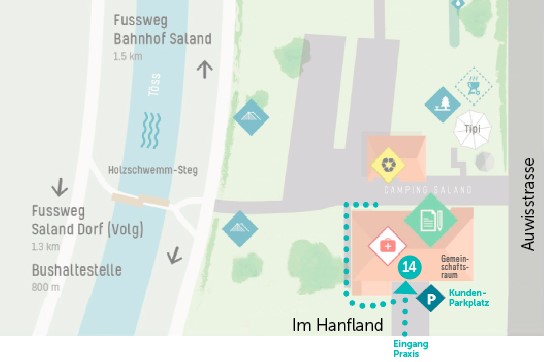Der Raum befindet sich an der Rückseite des Hauptgebäudes des Camping Saland. Die Zufahrt ist «Im Hanfland 14».